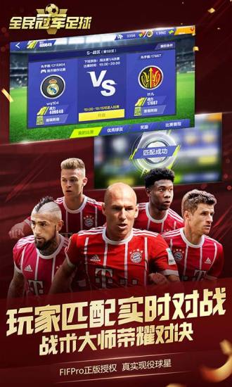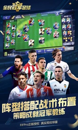 《全民冠军足球》是腾讯旗下的一款足球策略经营类手游。游戏已经获得了FIFpro(国际足球运动员协会)正版授权。拥有63个国家协会及百家俱乐部超过五千名现役球员肖像权。游戏拥有全球领先的动作捕捉技术,并由真实球员参与动作录制,逼真的3D建模,高质画面和引擎带来一场真实的赛场体验。