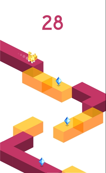 游戏中小球在悬空的跑道上不断的奔跑前进,滑屏屏幕给残缺的跑道补上黄色方块让小球安全的通过。