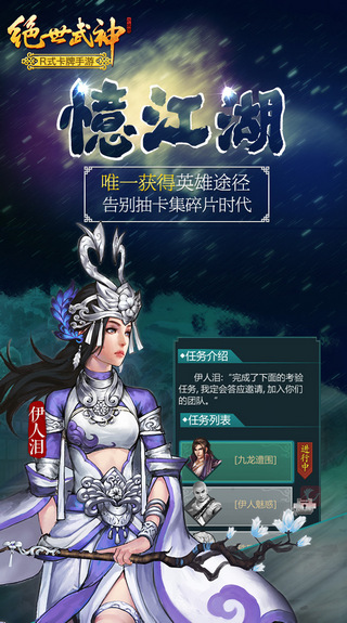 与以往小武侠题材游戏不同,《绝世武神OL》除了拥有高度还原剧情的常规副本外,还有独具特色的“忆江湖”英雄专属副本,玩家通关英雄副本后可免费获得关卡对应的英雄角色,这无疑是卡牌游戏玩家的一大福音,不用刷碎片,不用攒材料,直接免费获得!
