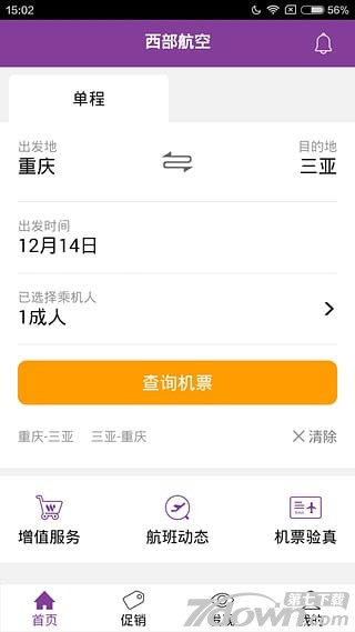 【服务说明】西部航空APP为您提供全面丰富的机票和增值产品的预订服务,让您用最低的价格购买您最需要的增值服务。包括:机票预订、逾重行李预订、机上餐食预订、航班动态查询、机票验真、促销活动等。