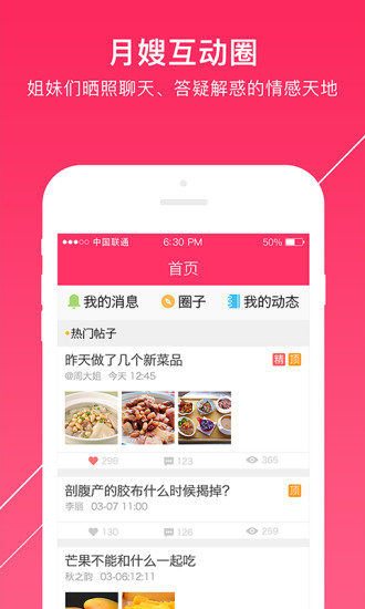 1、圈子社区月嫂姐妹们随时随地可以在圈子里聊聊护理心得体会,秀秀月子餐,晒和萌娃合照。在护理宝宝和宝妈过程中遇到问题时,还可以随时向圈子中的专家提问,母婴护理专家将为您答疑解惑,分享最科学育儿知识,快速提升姐们的各项护理技能。2、护理记录快捷的母婴护理记录工具,是月嫂姐妹们的得力助手。姐妹们可以和宝妈一同记录、查看宝宝和宝妈的20多项护理细节,例如母乳喂养、大小便护理、抚触等。每一项操作都有标准的护理规划和注意事项,便于姐妹们学习参考。3、丰富的个人背景资料展示姐妹们可以将自己的个人主页分享给客户,个人主页内容丰富,包括服务口号、个性化标签,认证信息等信息,一目了然,方便客户全方位了解。精彩相册还可以生动展示自己的服务细节,和宝宝的美好时光,雇主反馈的表扬信等,为姐妹们打造一张丰富好看的个人名片。