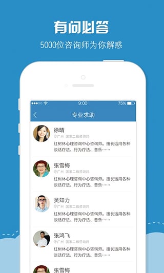 1、专业贴心:5000位心理咨询师进驻,为来访者提供专业的心理轻问诊,有需要的话还可以通过免费语音预约服务与咨询师一对一解答心事。