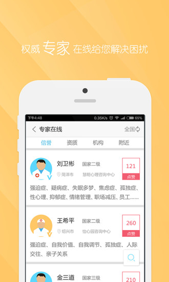 1.资深专家:拥有超过2000名专业资格认证的心理咨询专家入驻,每一位心理咨询师都在行业内部拥有知名名气。从“专业,贴心,便捷,自由”出发,用户所需要的就是我们所追求的。
