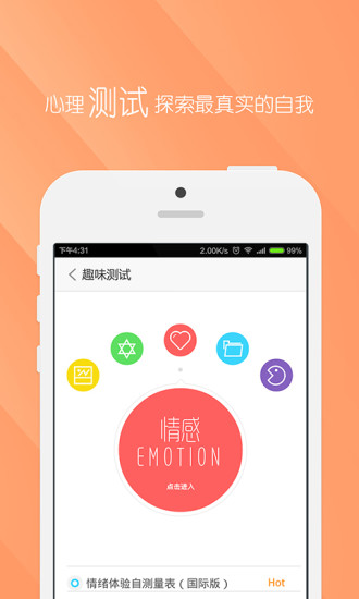 4.心理自测:通过小小的心理测试题,把关内心世界的权衡桥梁,明确自身心理的健康状态。既可找出问题,及时解决,亦可深刻了解,防患未然。