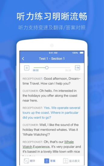 剑桥雅思5—10听力,精听精练,还有听力翻译和听力变速功能,给你最流畅的做题体验~