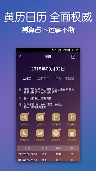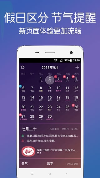华人日历万年历,史上最快最好用万年历。最适合华人使用的万年历,app中包含每日宜忌信息,让霉运远离您的生活。 最全面的日历查看功能,随时掌握日期,您的时间管理专家! 界面简洁,不冗余,凸显中国风哦,快来下载体验吧。