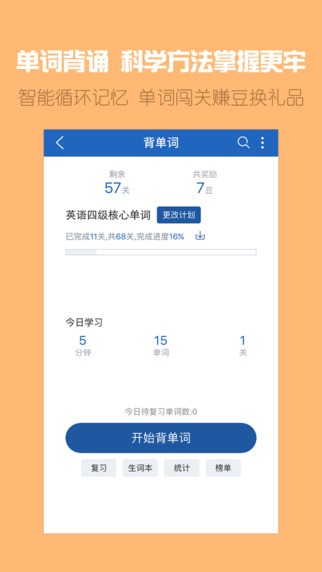 5、单词背诵:电脑手机同步进度,支持自定义生词本,背词闯关赚豆换礼品;