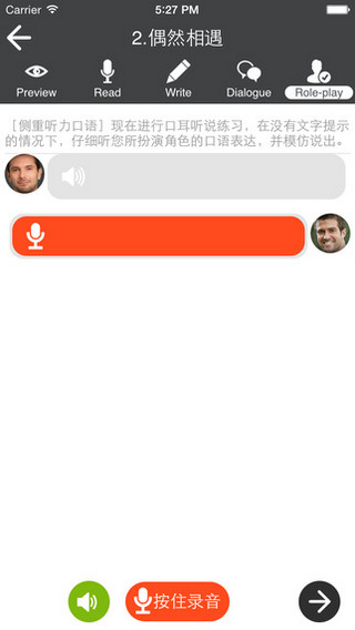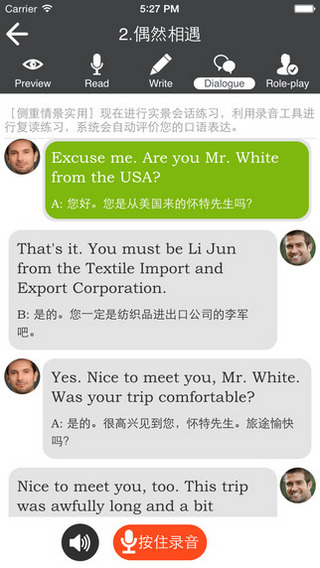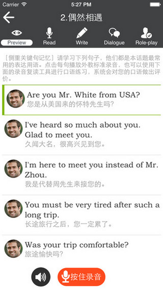 【读】:您可以跟着外教一起读,外教读一句,您模仿一句,iphone会将您朗读的句子录音并回放,逐字逐句纠正您的口语发音。 【说】:您可以和外教进行模拟实景会话练习,您选择一个角色来扮演,iphone可以将您的虚拟会话录音并回放,提升您口语的实用能力。