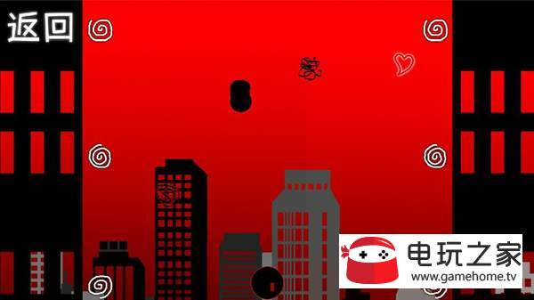 1、在这个黑红的画面中,控制着落日飞行的方向,躲避来自空中的各种东西