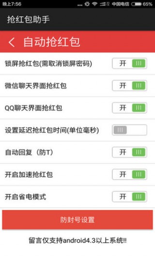 全新的简洁的界面,这是一款贴心极易上手的辅助小工具,软件具备对微信,QQ红包等进行秒抢,同时还增加了许多人性化的功能,比如抢完红包自动留言,抢到红包响铃,抢到震动以及抢到闪光等。软件去除了危险等级的权限,能让用户用的放心,并对软件进行了省电优化,是市面上功能全面,实用的抢红包助手。