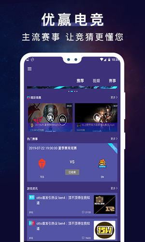 优赢电竞app是一款国内专业的电竞赛事app,优赢电竞app为广大用户提供免费的最新电竞赛事和电竞资讯等及用户可以在app里面进行互动交流从而更好的获取资讯服务,优赢电竞app致力于打造一款基于了解电竞赛事和移动社交相融合的“即时社交”的手机应用。