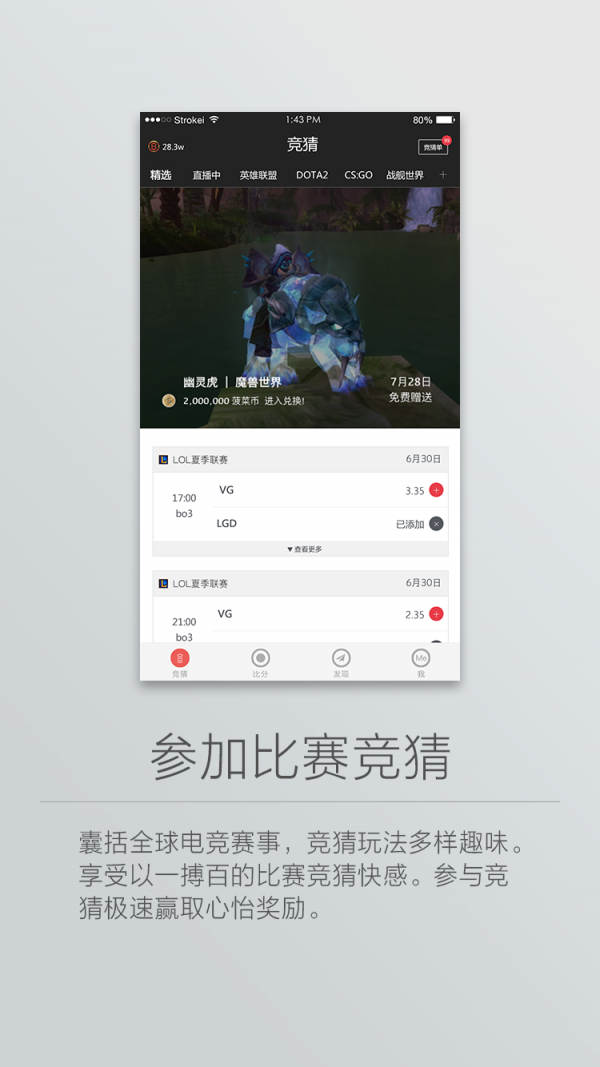 GUESS GAME有英雄联盟,DOTA2以及CSGO等类竞技游戏的各大赛事竞猜,并且拥有丰富的竞猜玩法,保证玩家能享受到不同竞猜的乐趣。