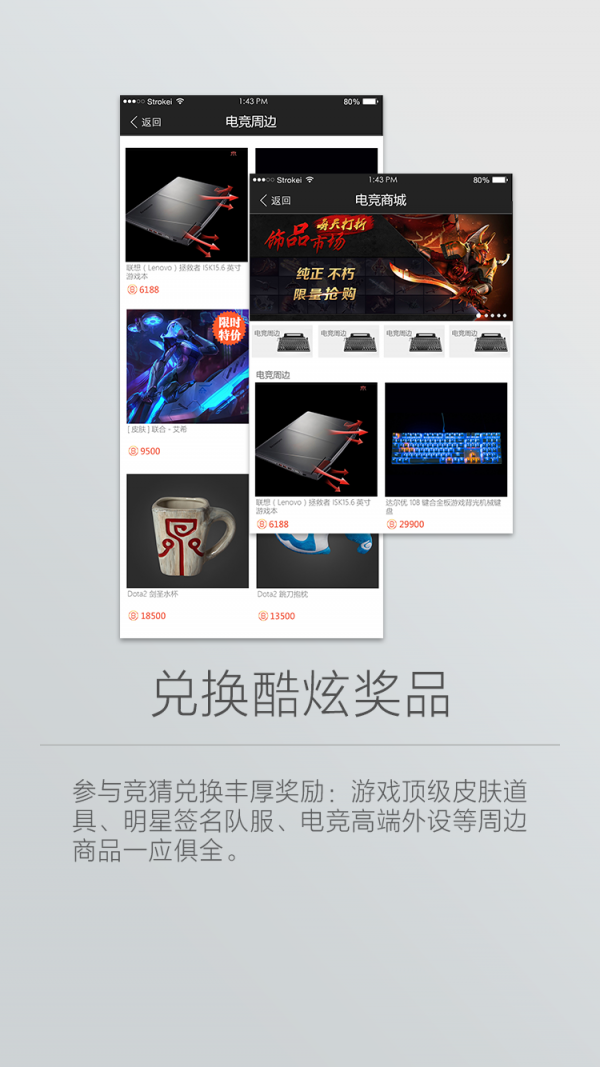 GUESS GAME的商城不仅为大家提供了电竞类的奖品(LOL点券,DOTA饰品等),还提供了京东E卡、各类视频网站会员等娱乐性产品,GUESS商城的礼品一应俱全,保证了各类玩家的需求。