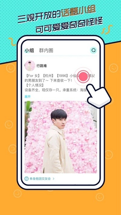 三观开放的话题小组,遇到充满情绪的真实的人。组长可自由定制小组的模板,诗歌、图集、语音、vlog、文字......我们将支持更多情绪化的模板,让你的小组更具独特性。我们支持审核入组或开放入组,支持小组成员内化为寸角群,支持小组高度自治;