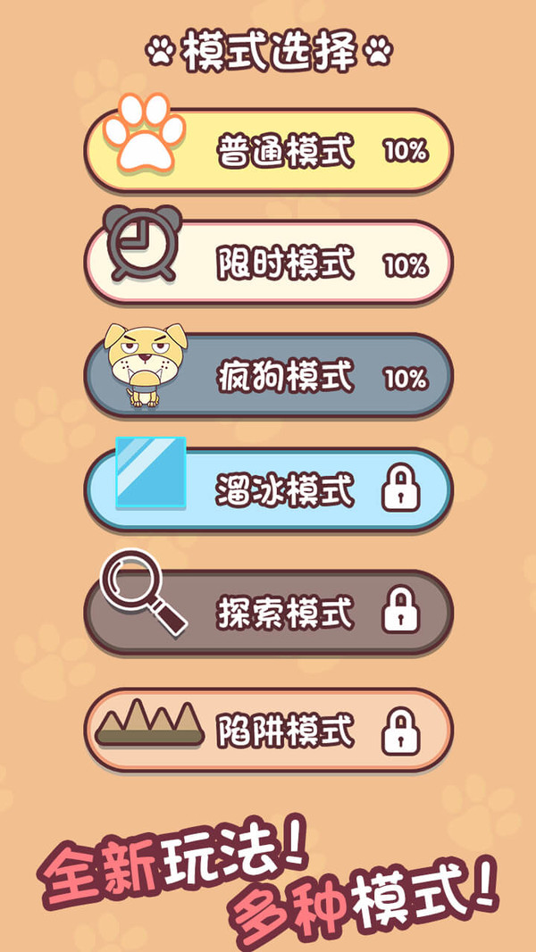 疯狗模式:躲避疯狗拾取小鱼获得胜利,被疯狗咬到,游戏失败。