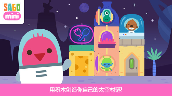 太空积木是一款好玩的精心策划的儿童亲子游戏,穿上你的太空靴,准备开启新的探险,用积木盖出星际城市!Sago Mini的小伙伴们需要你的帮助,在他们新发现的星球上建造一座城市。用古怪又有创意的积木为新邻居Zardozians小头星人和Zetoxians大头星人盖出空间站、房子,甚至是冰淇淋店!告诉你个小秘密:装上的门越多,就会有越多友善的太空生物出现喔!