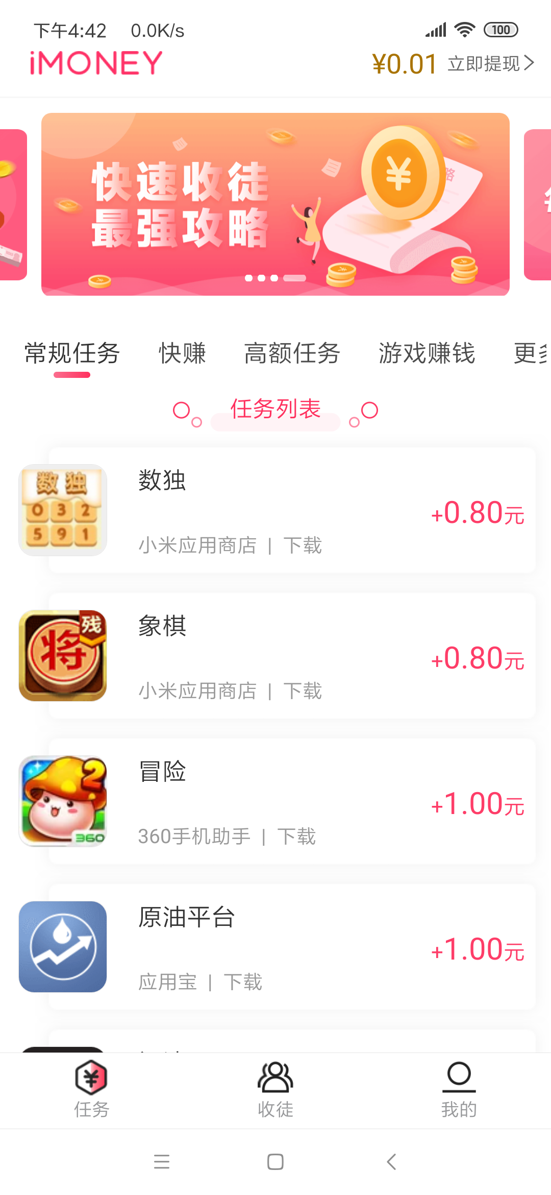 iMoney试玩平台是一款好用的网赚、试玩赚钱、任务赚钱软件,非常不错的手赚平台,这里的任务多多,单价丰厚,提现简单,2元就能提现,拥有常规任务、快赚、高额任务、游戏赚钱等多种任务,喜欢的朋友快来这里试试吧!