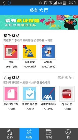 1、技能板块罗列了所有的技能类别,用户可以点击各个技能进行测试认证。通过技能测试方可接取任务;