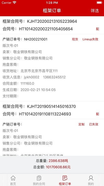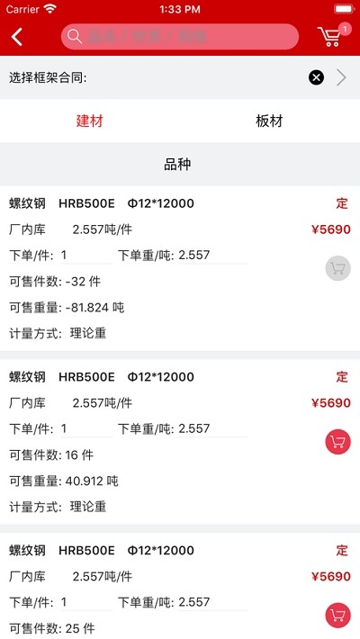 屏幕下方“我的”→“登录”,按用户类型进行注册,注册成功后登录,返回“首页”→“现货中心”,选择建材、板材、副产品三个产品大类→多项选择品种、品名、材质、规格等;