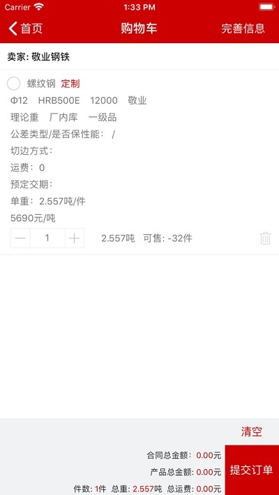 点击右上角购物车图标,查看购物车内物品→完善信息,根据实际情况依次填入必填内容→点击确认→选中购物车中物品提交订单;