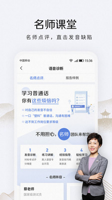 使用与国家普通话水平测试系统相同的智能语音测评技术;普通话测试全真模拟,涵盖普通话考试全题型,轻松说一口流利的普通话,就用畅言普通话APP!