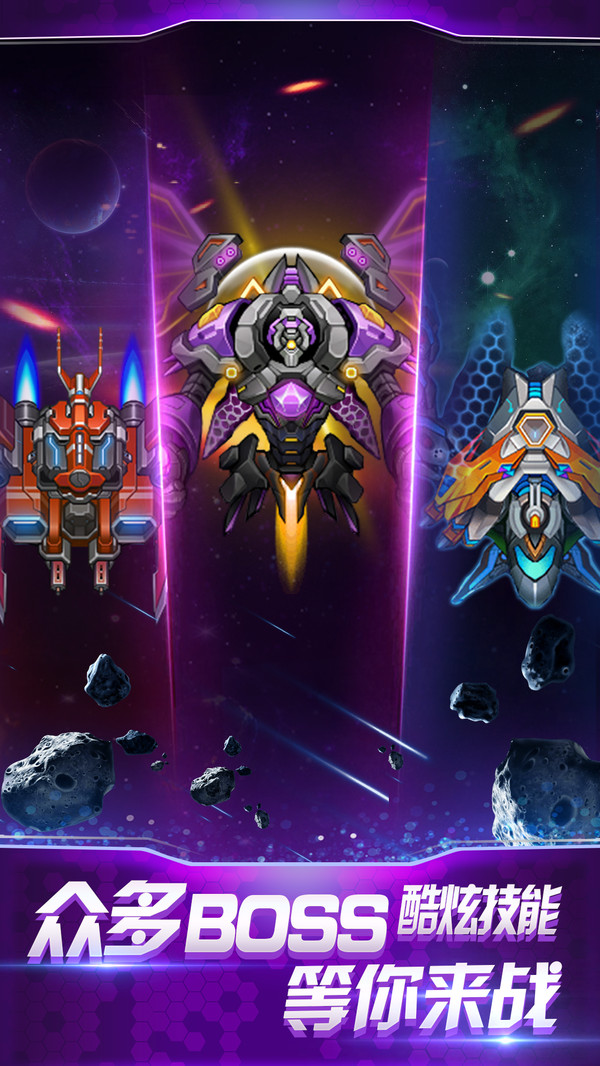 挑战BOSS是最激动人心的事情,火力集中,保护好船避免被子弹击中。各种宇宙飞船拥有独特的武器、导弹和特殊技能。在游戏过程中,你可以赢得升级飞船的机会,从而释放其全部的杀伤力。