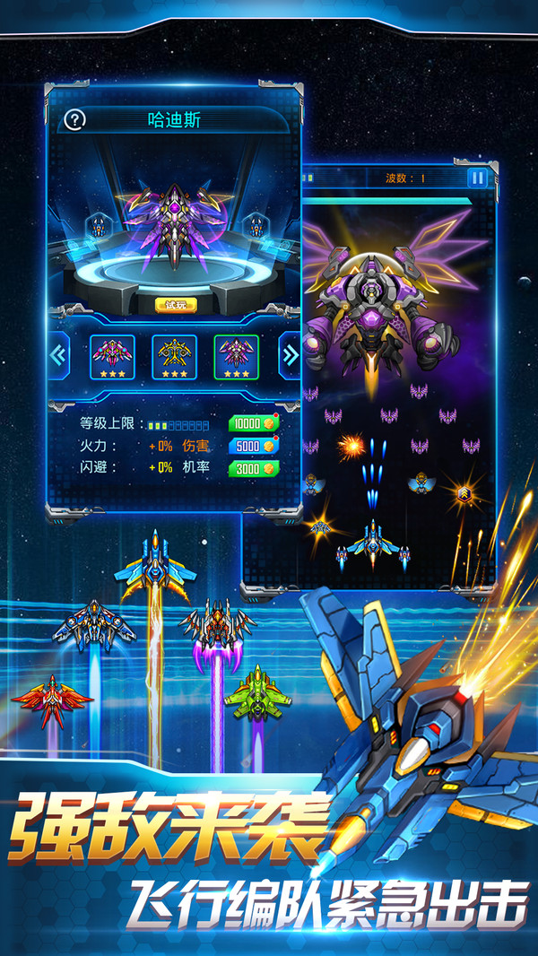 飞行闪击战是一款好玩的精心策划的射击游戏,如果你是太空射击游戏的爱好者,如果你喜欢模拟宇宙射击,那么《飞行闪击战》绝对是你的不二之选。选择更多的飞机和酷炫的外观,不同的飞机有独特的弹幕,更强大的动力升级飞船。
