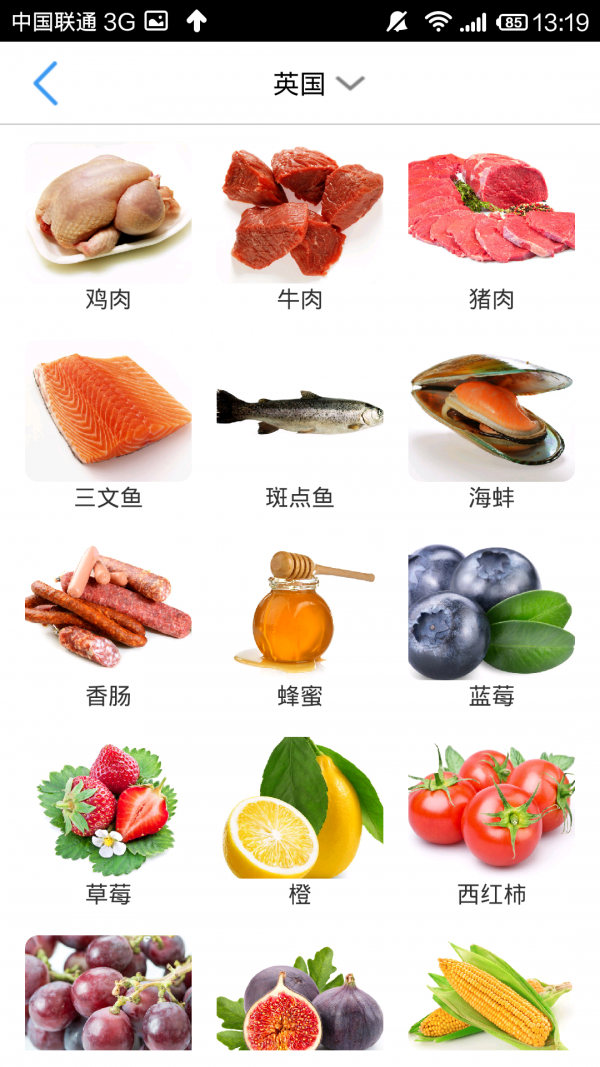随便点进一个餐饮,他还有个分类选择,随便点进去一个,可以看到一堆相关的美食图片,还能选择不同的国家,除了有该国家文字,还能带语音读出来,真的相当方便呢。