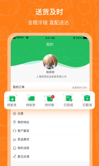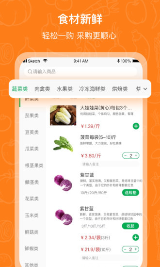 平台app主打蔬果菌菇、米面粮油、 牛羊肉禽、调味餐料、海味干货、冷冻水产、环球海鲜、烟酒茶饮、地方特产、进口食品等10几大品类;集食材浅加工、分拣、分装、冷链仓储、物流配送服务、电商交易、食材供应链产业配套于一体。