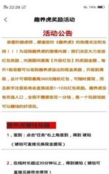 趣养虎是一款超级好玩的养成领红包游戏,享受这个超级好玩的养成游戏,在这个游戏中你将感受全新的内容;邀请新人也是可以得到很多的一些金币,分红都是可以自己争取的。注:仅提供相关信息介绍,理财有风险,投资需谨慎,请仔细甄别,切勿上当受骗!