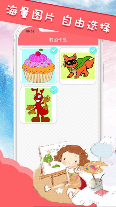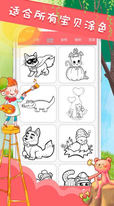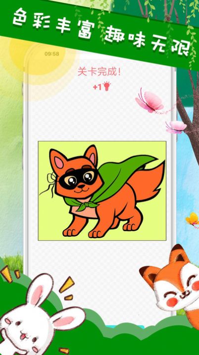 1.超多卡通风图片不断更新,无论是风景,动物,人像全都有,按照正确操作完成涂色;