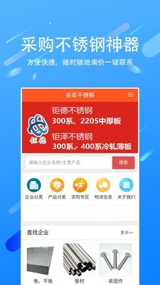 用户可以在这里进行不锈钢商品的购买,用户可以根据企业分类或者产品分类来进行快速的查找,不仅如此,平台上面还为用户提供了求购专区,用户可以在这里发布自己的求购信息哦,喜欢的用户就不要犹豫了,快来下载吧!