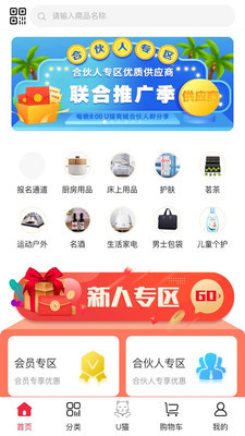 用户可以在这里购买到超多优质的商品,户外、百货、护肤等等,生活中各方面需求都能帮助用户进行满足到,并且平台上面还为用户提供了新人专区、会员专区、合伙人专区等不同专区版块,都有不同的优惠可以享受到哦,分享商品给好友还可以赚取佣金奖励!
