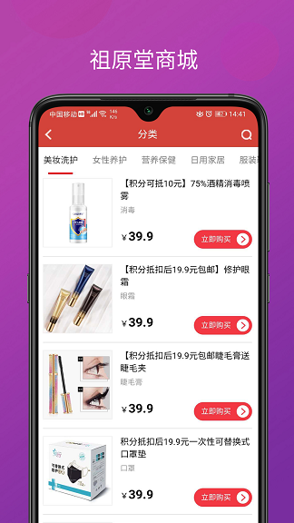 软件中包含了美妆洗护、女性养护、营养保健、日用家居、服装鞋帽等等,每次购买都能获得相应的积分,而使用一定的积分可以抵扣部分价格,让商品变得更加便宜,同时还有很多优惠券优惠活动等你来参与,快来下载吧!