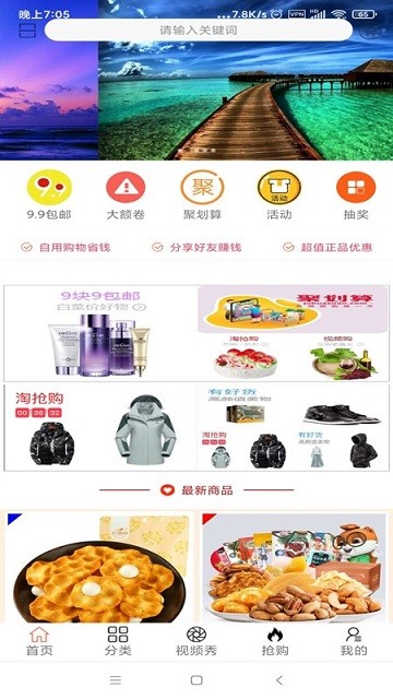 软件首页便是几项省钱的功能栏目,9.9包邮、大额券、聚划算、抽奖和活动,让用户能够花最少的钱买最好的东西,软件内的商品种类也是繁多,海量商品一应俱全,让用户拥有最好的购物体验,买的开心,花的省心,用的安心!