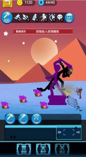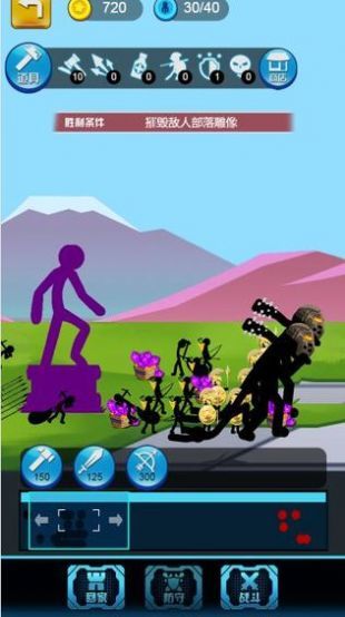 游戏的主角是一个火柴人的形象,将组建一支强大的部队,这里有各种各样的角色,剑士、矛士、弓箭手、巫师等各司其职,打造出真正,强大的部队,他们将各自执行自己任务,开采资源,打造成一个攻防有素的国家。派兵布阵,击败更多的敌人,守卫自己的家园。