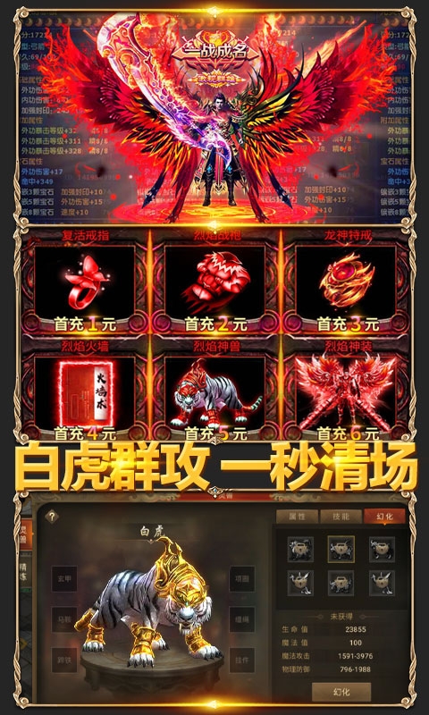 1、一款真3DRPG全新传奇手游,开局就送328充值和金甲白虎,每天登陆还送神装一百连抽;