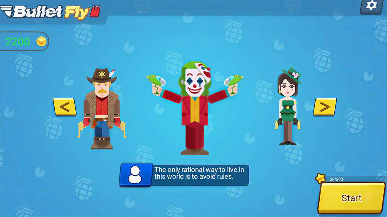 让子弹飞飞是一款趣味射击游戏,游戏对萌新很友好,新手指引很完善,直观的教学模式,上手只要30秒。海量各不相同的游戏关卡,每个关卡都有独特的布局,充分发挥你的智慧。极简设计,将操作简化到极致,只需一根手指,人人都可以玩的射击解谜游戏。很多丰富有趣的角色在等你解锁,小丑、牛仔、护士等等不同的角色等你解锁。