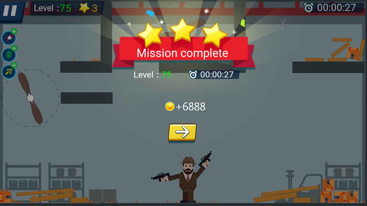 你需要做的是在每一关找到最佳射击角度,利用子弹的反弹来命中敌人。每一关子弹数量都是有限的,你需要找到最佳角度,并准确地开出枪来,还要保证自己不在爆炸的冲击之内,充分考验你的反应和智慧。