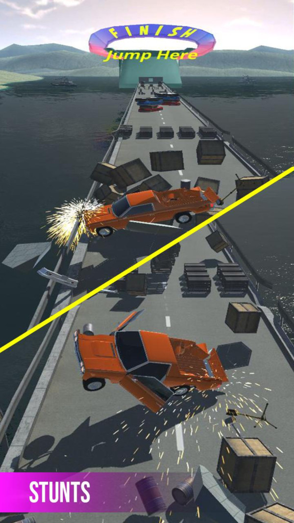 然后通过平台一飞冲天。在你落地之后会遇到各种障碍物,而你就要在这里对汽车进行破坏。游戏的玩法非常的解压,各种各样的汽车也是可以随意选择。