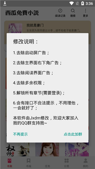 西瓜免费小说是一款非常好用的小说阅读的软件, 去除启动屏广告 去除主界面右下角广告 去除阅读界面广告 去除多余权限 解锁所有章节(需要登录)