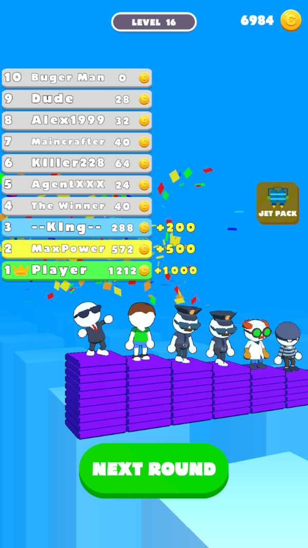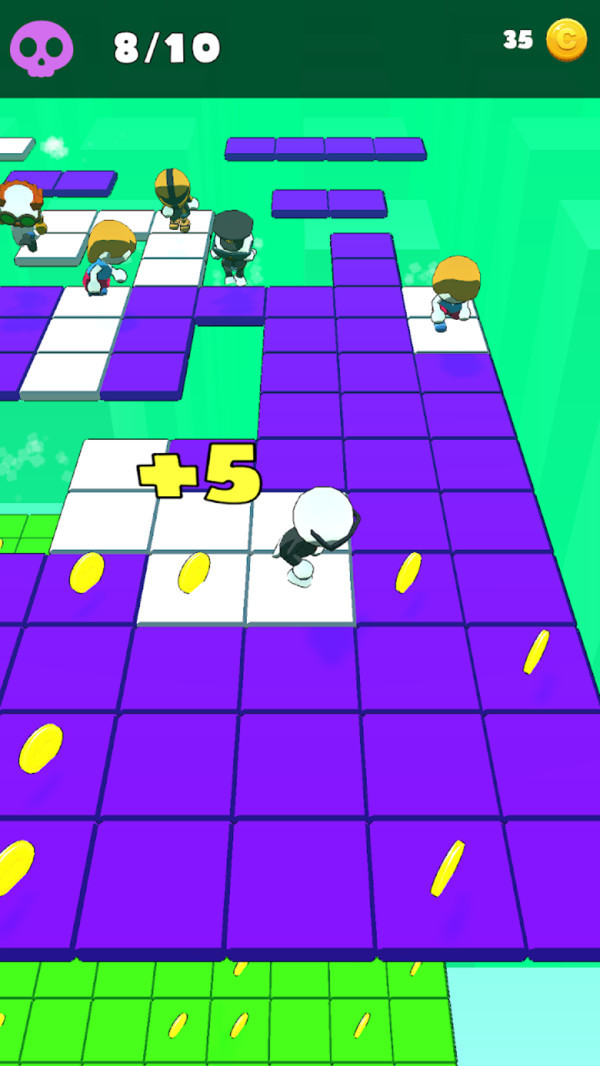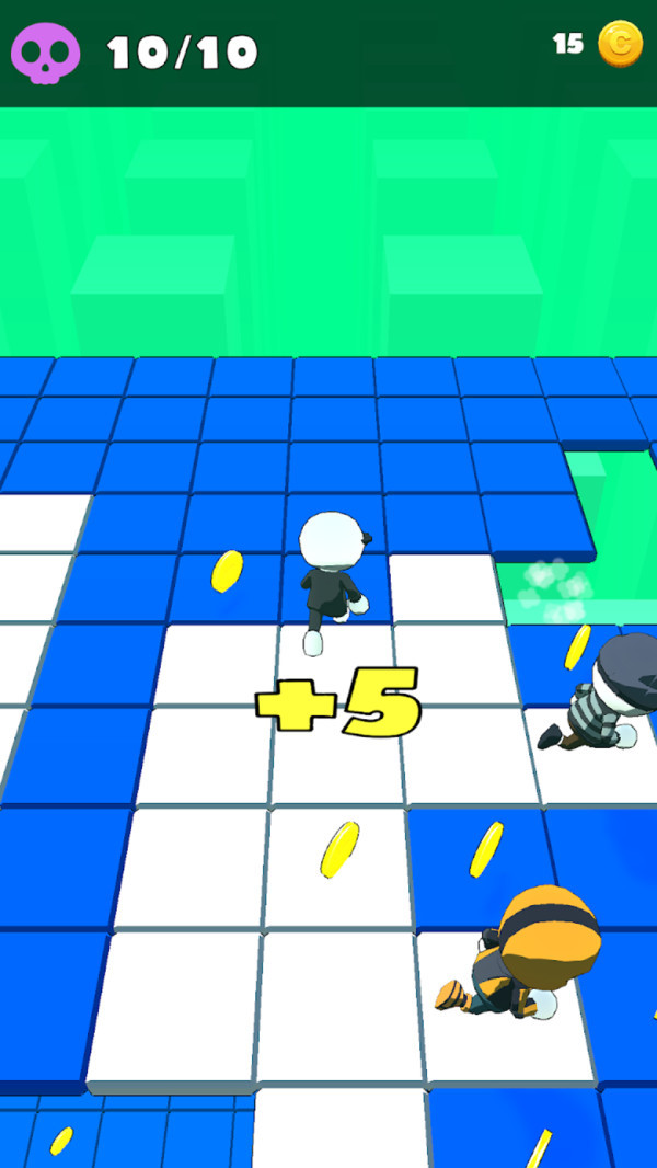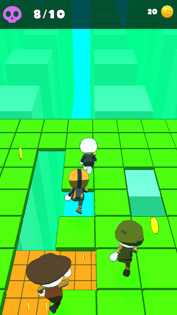 现在为了证明你的实力,你必须要要和其他特工在关卡中一较高下。你的脚下会有很多层方块,而每一个方块在你踩完之后都会消失,如果你一路掉下去的话就算失败了,而整场比赛只会有一个赢家,所以你要尽可能的让自己在方块上站的更久。