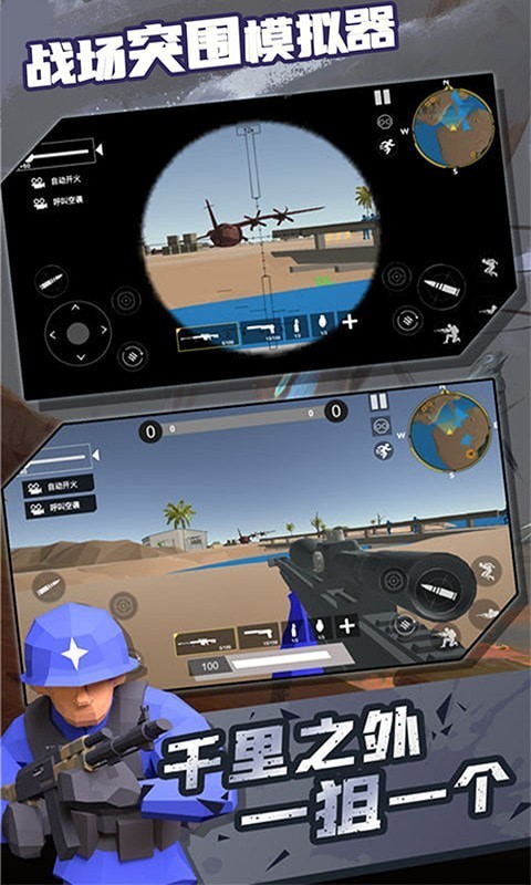 战场突围模拟器是一款款射击冒险类手游,真实的战斗现场,在危险的环境中玩家要开枪打败这里的怪物们。玩家可以根据自己的想法来制作属于自己的特色地图,在和别的玩家对抗的过程中,玩家可以解锁新的武器,上天入地的都有。