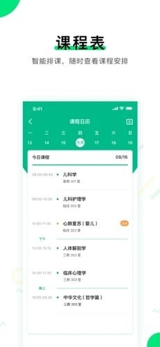 智能排课,助力医学生日常课程管理,课程表随身带,随时随地查看日程安排。
