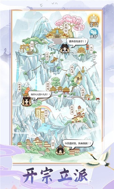 修行之路始于立派,建设经营门派,自由招收弟子,悉心培养人才,共同完成修仙历练:领悟功法、炼丹铸器、结契灵兽、秘境探索、坊市交易等等,一切磨炼都是为了带领弟子们得道成仙,完成壮大宗门的心愿。