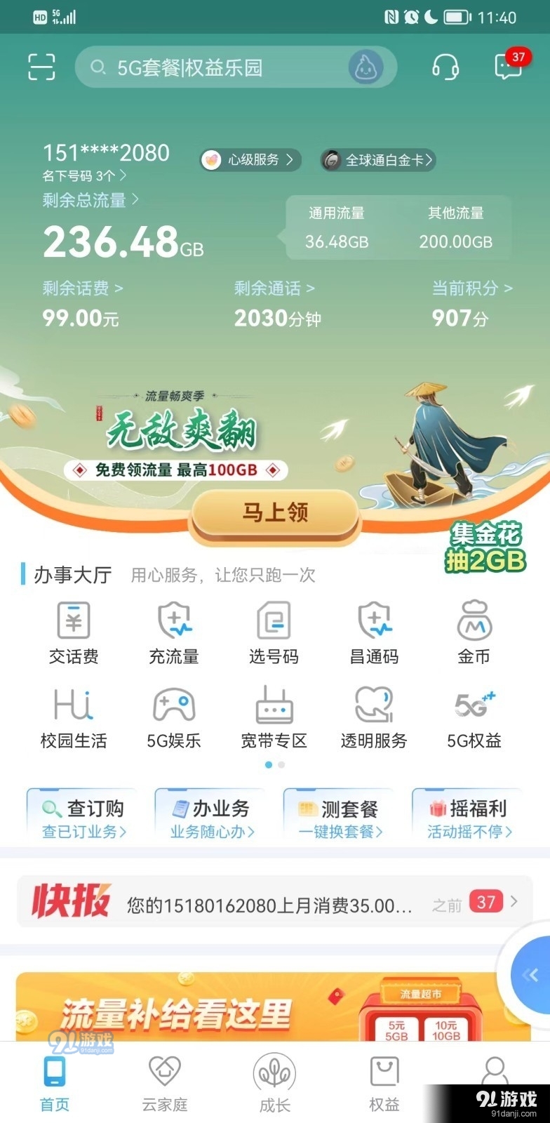 2. 业务办理:可在线办理流量套餐变更、套餐升级、开通增值业务等多种移动业务。