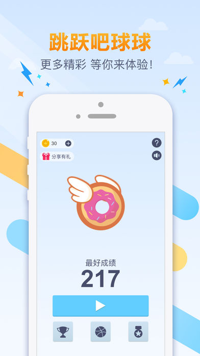 1.通过点击手机屏幕使“球球”不断跳跃前进,由上至下通过空中的“篮筐”。