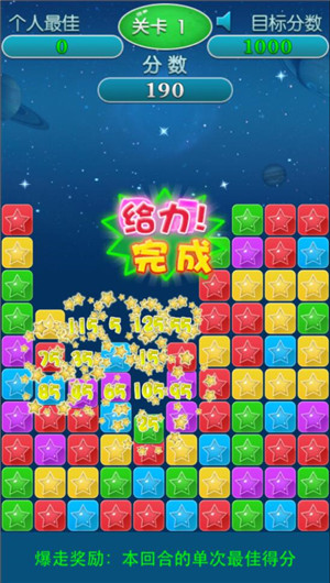 经典的消除玩法狂暴升级。不断突破自己的得分,更要星星全部消灭,完成爆走!