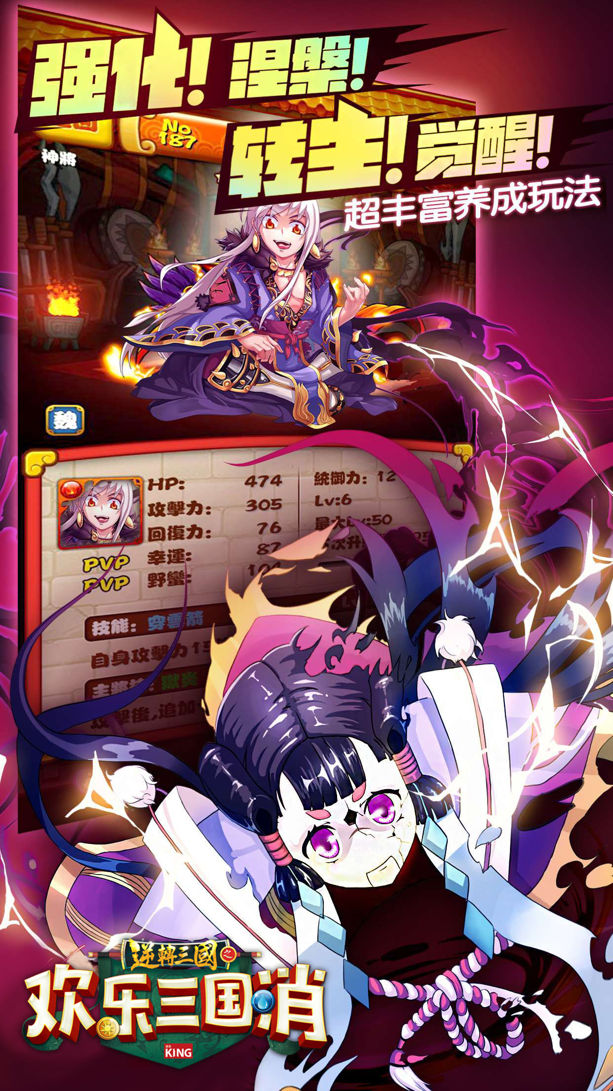 移动同色宝珠,组合combo消除,连击越多,攻击越强。五色宝珠相生相克,根据敌军属性,移动属性相克的宝珠进行致命讨伐。收集武将谋臣,进入武将育成(近1500名角色),进阶强化转生涅槃封神,打造属于自己的不败阵营。在三国历史超200个著名战役的战场中,令游戏中的朋友成为“援军”,共享驰骋沙场的无限乐趣。