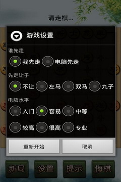 中国象棋,可人机对弈或双人对弈,支持悔棋功能、电脑难度选择、让子、电脑提示等功能,界面美观,操作方便。电脑棋力高,可自由选择电脑棋力。象棋是由两人轮流走子,以“将死”或“困毙”对方将(帅)为胜的一种棋类运动,有着数以亿计的爱好者。它不仅能丰富文化生活,陶冶情操,更有助于开发智力,启迪思维,锻炼辨证分析能力和培养顽强的意志。